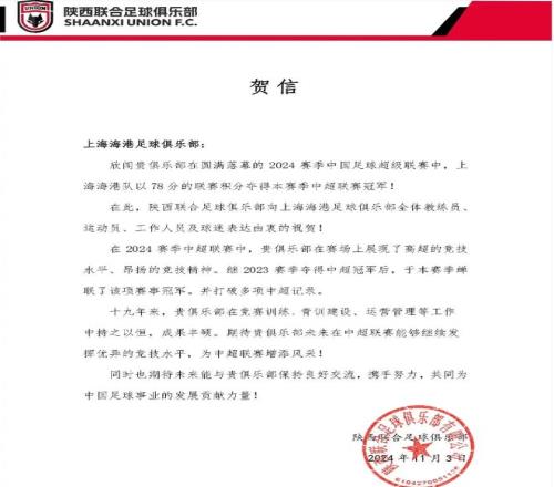 虽然海港三连冠时没见陕西联合的贺电,但2024赛季海港夺取两连冠时,当时尚在中乙的他们是发过贺电的(下图)。