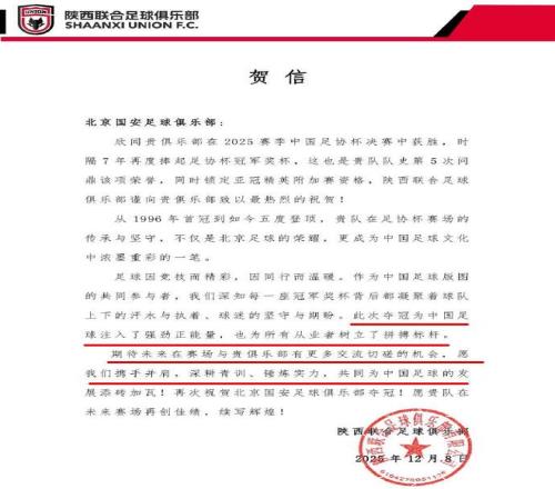 足协杯夺冠后,还有一支中甲球队给北京国安发出贺电,他们就是陕西联合足球俱乐部(上图)。该俱乐部称赞北京国安的夺冠,是为中国足球注入强劲的正能量,也为所有从业者树立拼搏标杆。最后他们希望跟北京国安在青训上有更多切磋交流。