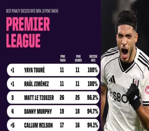 英超历史点球命中排行:劳尔希门尼斯和亚亚图雷均11罚全中
